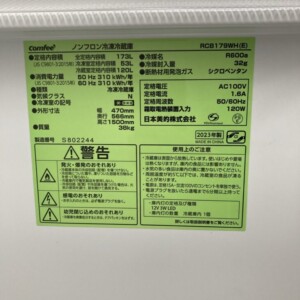 comfee(コンフィー)173L 2ドア冷蔵庫 RCB179WH(E)2023年製