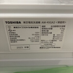弊社の無料出張サービスをご利用くださいました。TOSHIBA(東芝)4.5キロ 全自動洗濯機 AW-45GA2(W) 2023年製