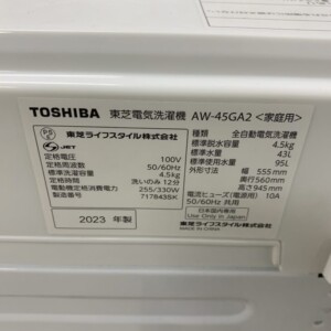 TOSHIBA(東芝)4.5キロ 全自動洗濯機 AW-45GA2 2023年製