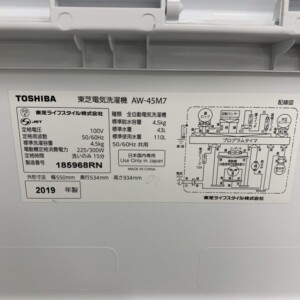 使用は室内でされていたため、全体的に保存状態も良好でした。TOSHIBA(東芝)4.5キロ 全自動洗濯機 AW-45M7 2019年製