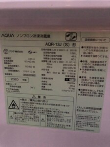 AQUA(アクア)126L 2ドア冷蔵庫 AQR-13J(S) 2020年製
