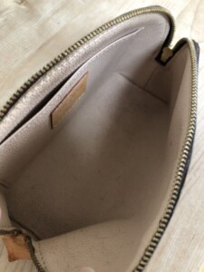 お買取させていただいたポーチは、7年ほど前に百貨店で購入されたお品とのことでした。元箱や保存袋などの付属品はありませんでしたが、本体のみでも中古市場で根強い人気のあるモデルです。ファスナーの滑りも良好で、金具部分にも目立ったメッキ剥げや劣化は見受けられませんでした。内側には使用感として化粧品による軽微な汚れが見られましたが、破れや破損はなく、全体的には使用頻度も少なく美品と判断いたしました。