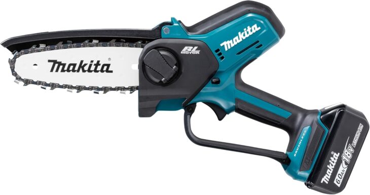 マキタの充電式ハンディソー「MUC150D」は、18Vリチウムイオンバッテリ対応のコンパクトなチェンソーです。ガイドバー長さは150mmで、庭木の剪定や小径材の切断など日常のメンテナンス作業を軽快にこなせます。薄い刃幅の薄刃仕様により切断抵抗を抑え、鋭い喰いつきでスピーディーに作業できるのが特長です。オイルは自動給油方式を採用し、可動式ガードとゴム製ハンドガードを備えることで、作業時の安全性と取り回しやすさにも配慮されています。ブラシレスモータの搭載により、高効率かつ力強い切断を実現します。チェーンは80TXL仕様(ゲージ厚1.1mm、ピッチ0.325″)に対応します(※一部M11仕様チェーン刃との互換に注意)。