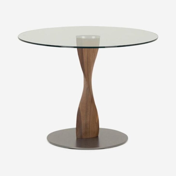 porada(ポラダ)の「SPIN(スピン)」ダイニングテーブルは、柔らかな三次曲線で削り出されたレッグが主役のラウンドテーブルです。木の根元に近い部分のみを厳選した“スーパー・プライム・クオリティ”のウォールナット無垢材を用いることで、節が少なく、美しい木目が際立つ上質な仕上がりになっています。透明なガラス天板を組み合わせることで、どの角度から眺めてもレッグの彫刻的なシルエットを楽しむことができ、アートピースのように空間のアクセントになる一台です。コンパクトな円形天板は、ダイニングだけでなく、リビングダイニング一体の空間にも取り入れやすく、軽やかで抜け感のあるコーディネートを叶えてくれます。