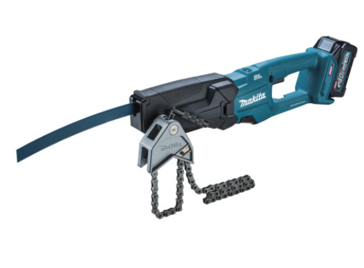 チェーンバイス付き仕様により鋼管やステンレス管、鋳鉄管など太径の材料固定が簡単にでき、パイプの切断作業でも安定した切れ味を発揮するモデルとなっています。40Vmaxリチウムイオンバッテリー対応で高出力ブラシレスモーターを搭載し、重負荷の切断作業時でも回転数が落ちにくい定回転制御を採用しています。チェーンバイス装着により管材にしっかり固定できるため、作業効率と安全性が向上します。また、チェーンバイスを取り外して通常のレシプロソーとしても使えるなど幅広い作業に対応します。