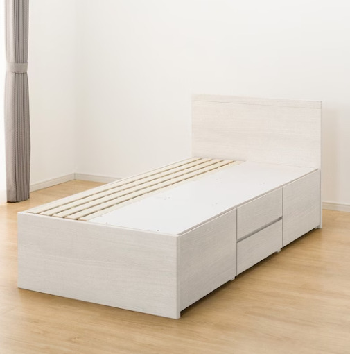 ニトリの「大容量収納付き すのこチェストベッドフレーム」は、ベッド下に大小の引出しを備えた収納力に優れるシングルベッドフレームです。すのこ床板仕様で通気性を確保しつつ、引出しは衣類や季節用品を効率的に整理できます。ヘッドボード周りに小物を置けるスペースもあり日常使いに便利。また、シンプルなデザインで幅広いインテリアにマッチします。収納付きベッドとして人気が高く、クローゼットが手狭な一人暮らしの住まいにもおすすめです。