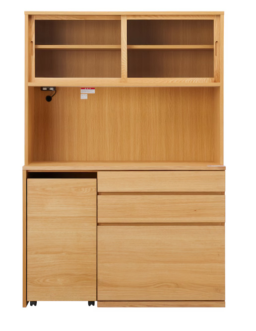 無印良品の「木製カップボード・幅120cm・オーク材」は、引き出せるワゴンや深さの違う引出しを備えた、収納力の高い大型カップボードです。上扉は引戸仕様で、開閉時に手前へ扉が張り出しにくく、限られたキッチンスペースでも使いやすい設計です。