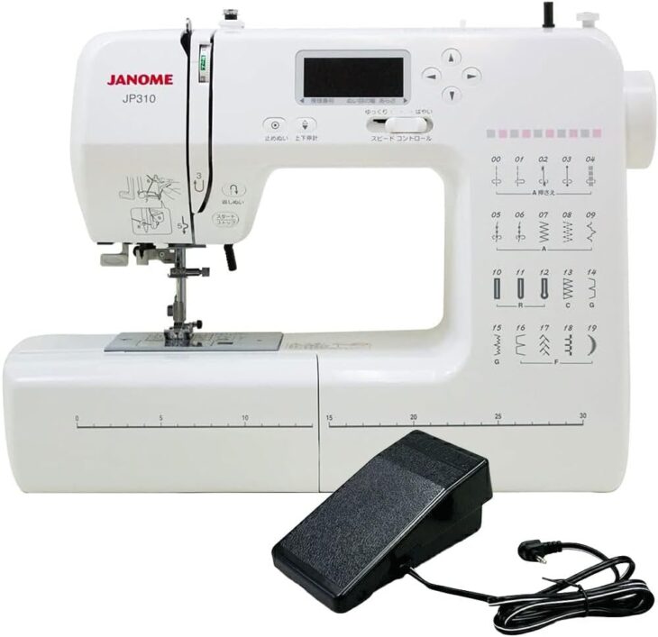 本商品は、ジャノメ(Janome) コンピュータミシン「JP-310」です。 ワイドテーブルとフットコントローラーが付属しており、衣類の裾上げや小物作りはもちろん、カーテンなどの大きめ作品でも布を支えやすく、作業がスムーズに進められるのが特長です。