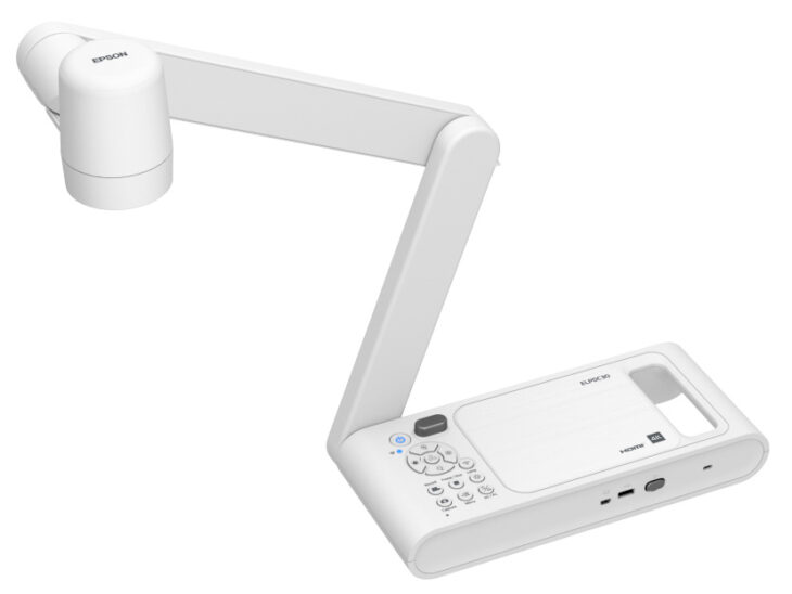 EPSONのELPDC30は、教材や書類、立体物などを大きく鮮明に映し出せる書画カメラ(実物投映機)です。有効画素数4Kに対応しているため、被写体の細部までクリアに撮像しやすく、授業や会議、プレゼンテーションで小さな文字や細かな資料も見やすく表示できるのが特長です。A3サイズまで対応しているため、大きめの資料や図面、見開き資料などもそのまま映しやすいモデルです。